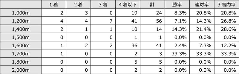 前走の距離別成績を見ると、1,400m以下の馬は[8-8-8-70](3着内率25.5%)、1,400m超の馬は[2-2-2-46](3着内率11.5%)となっている。なお、第22回(平成27年)以降の過去4年に限ると、1,400m以下の馬は[4-3-4-30](3着内率26.8%)、1,400m超の馬は[0-1-0-18](3着内率5.3%)である。前走で1,400m超のレースを使っていた馬は、評価を下げた方が良さそうだ。