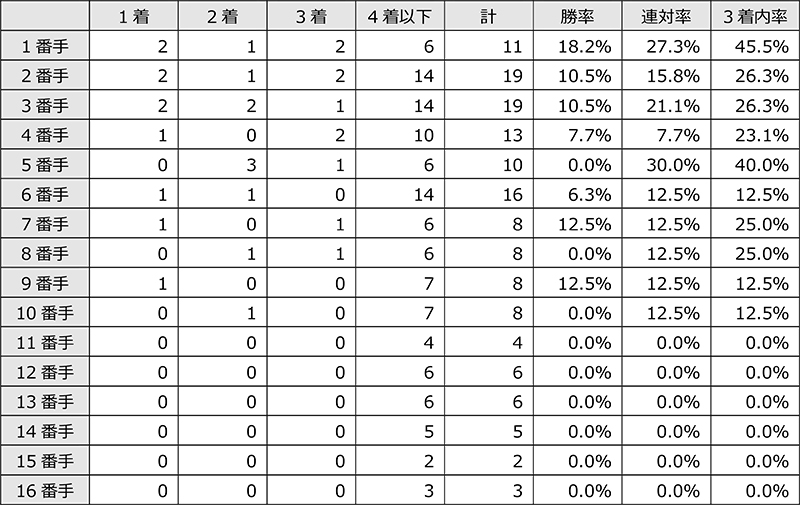 単勝人気順別成績を見ると、「1番人気」の馬は[3-0-0-7](3着内率30.0%)となっている。昨年の第25回(平成30年)こそ単勝1番人気のキタサンミカヅキが優勝を果たしたものの、3着内率が2~4番人気馬よりも低い点は気掛かりだ。