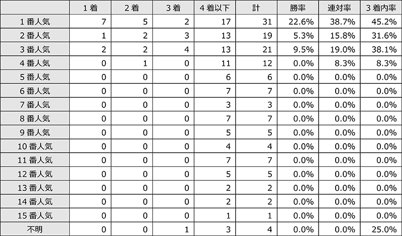 単勝人気順別成績を見ると、3番人気以内の馬は[7-9-5-9](3着内率70.0%)、4~7番人気の馬は[3-1-5-31](3着内率22.5%)、8番人気以下の馬は[0-0-0-66](3着内率0.0%)となっている。上位人気馬が強いレースと言えそうだ。