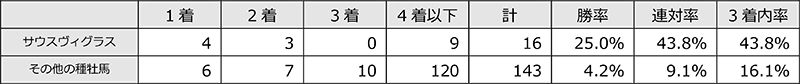 種牡馬別成績を見ると、サウスヴィグラスが3着内率43.8%と優秀な成績を収めている。現2歳世代が“ラストクロップ”であり、出走してくるとすれば今年までだが、サウスヴィグラス産駒にはぜひ注目しておきたい。