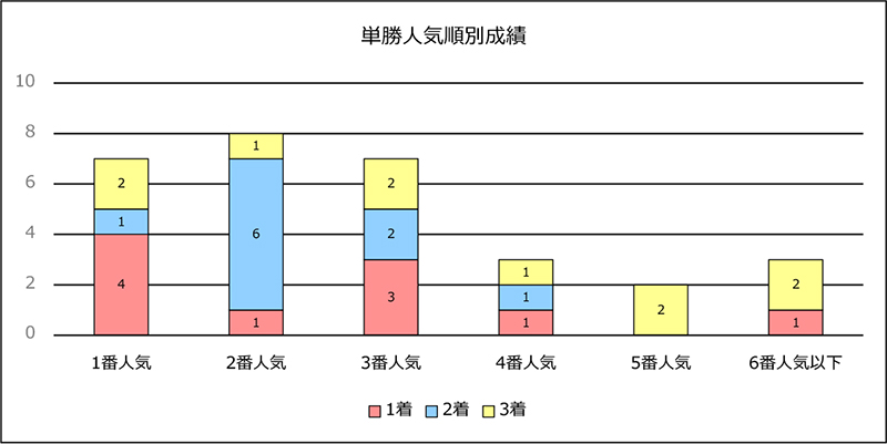 単勝人気順別成績を見ると、3番人気以内の馬は[8-9-5-8](3着内率73.3%)、4~7番人気の馬は[2-1-5-32](3着内率20.0%)、8番人気以下の馬は[0-0-0-70](3着内率0.0%)となっている。上位人気馬が強いレースだ。