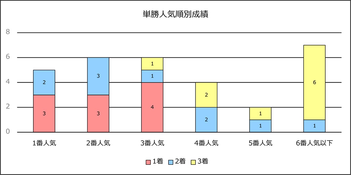 単勝人気順別成績を見ると、4番人気以内の馬は[10-8-3-19](3着内率52.5%)、5~8番人気の馬は[0-2-5-33](3着内率17.5%)、9番人気以下の馬は[0-0-2-49](3着内率3.9%)となっている。まずは前評判の高い馬に注目するべきだろう。