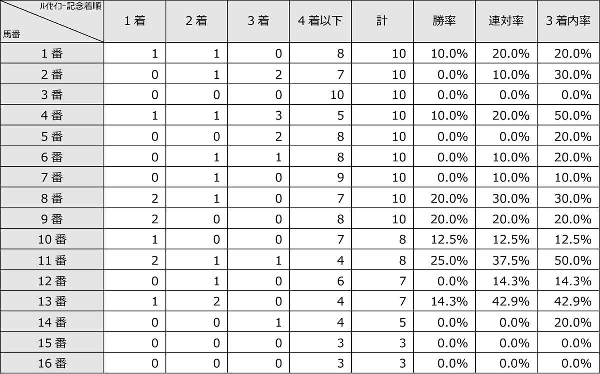 馬番別成績を見ると、1~3番の馬は[1-2-2-25](3着内率16.7%)、4~11番の馬は[8-5-7-56](3着内率26.3%)、12~16番の馬は[1-3-1-20](3着内率20.0%)となっている。ただし、SⅠとして施行された第53回(令和2年)以降の過去5年に限ると、1~3番の馬は[0-0-1-14](3着内率6.7%)、4~11番の馬は[5-5-4-23](3着内率37.8%)、12~16番の馬は[0-0-0-8](3着内率0.0%)である。近年の傾向からは、枠順も重要なファクターと言えそうだ。