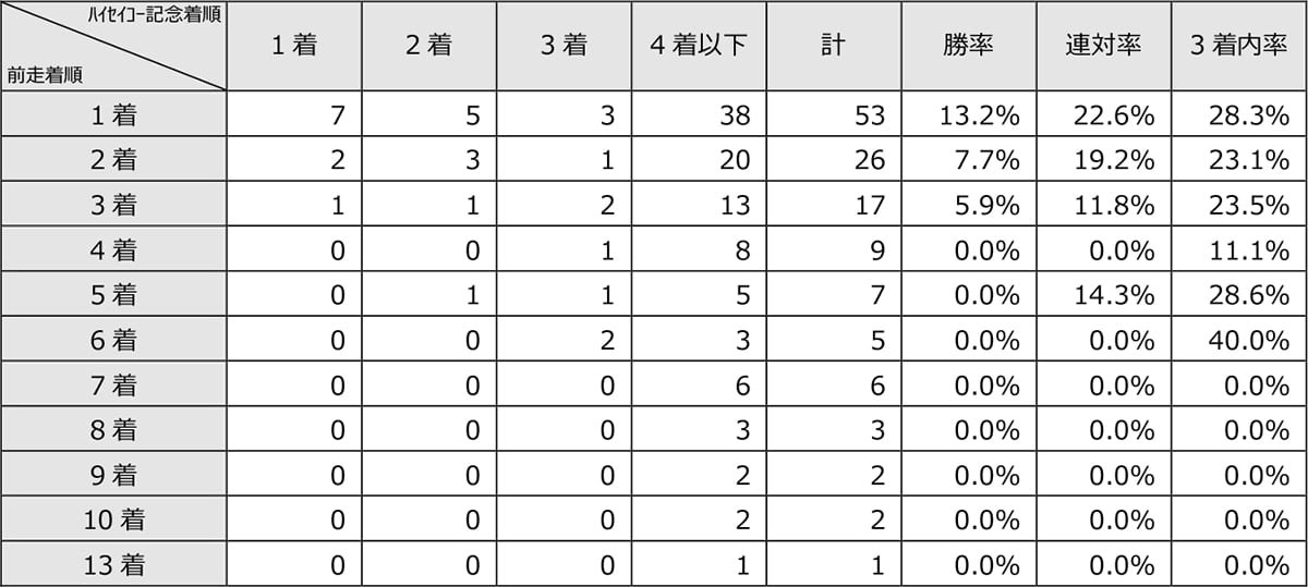 前走の着順別成績を見ると、6着以内の馬は[10-10-10-87](3着内率25.6%)、7着以下の馬は[0-0-0-14](3着内率0.0%)となっている。前走で大きく敗れてしまった馬は、評価を下げるべきだろう。