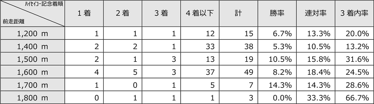 前走の距離別成績を見ると1,400m以下の馬は[3-3-2-45](3着内率15.1%)、1,400m超の馬は[7-7-8-56](3着内率28.2%)となっている。なお、SⅠとして施行された第53回(令和2年)以降の過去5年に限ると、1,400m以下の馬は[1-1-1-18](3着内率14.3%)、1,400m超の馬は[4-4-4-27](3着内率30.8%)である。臨戦過程を比較する際は、前走の距離もチェックしておきたい。