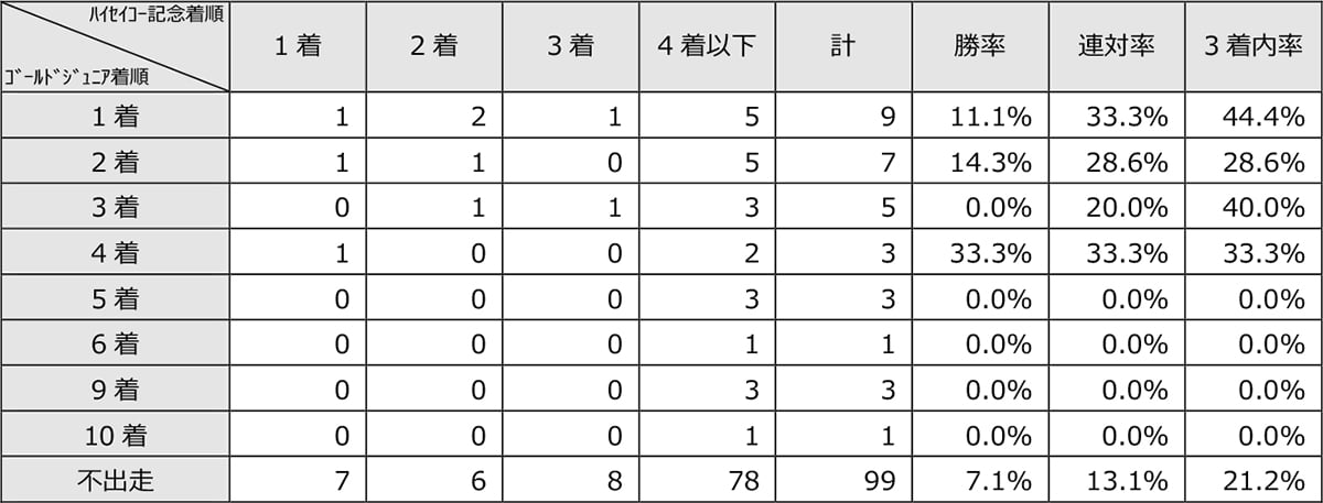 “ゴールドジュニア”(令和元年までは“ゴールドジュニアー”の名称で施行)における着順別成績を見ると、4着以内の馬は[3-4-2-15](3着内率37.5%)、5着以下の馬は[0-0-0-8](3着内率0.0%)、「不出走」の馬は[7-6-8-78](3着内率21.2%)となっている。なお、第51回(平成30年)以降の過去7年に限ると、4着以内の馬は[3-4-2-6](3着内率60.0%)、5着以下の馬は[0-0-0-5](3着内率0.0%)、「不出走」の馬は[4-3-5-56](3着内率17.6%)である。前哨戦の“ゴールドジュニア”で好走を果たした馬は、再び上位に食い込む可能性が高いと見て良さそうだ。