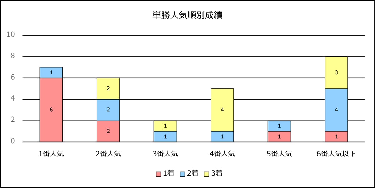 単勝人気順別成績を見ると、2番人気以内の馬は[8-3-2-7](3着内率65.0%)、3~4番人気の馬は[0-2-5-13](3着内率35.0%)、5~7番人気の馬は[1-4-1-24](3着内率20.0%)、8~12番人気の馬は[1-1-2-46](3着内率8.0%)、13番人気以下の馬は[0-0-0-35](3着内率0.0%)となっている。人気薄の馬もある程度は健闘しているが、まずは上位人気グループの馬に注目したい。