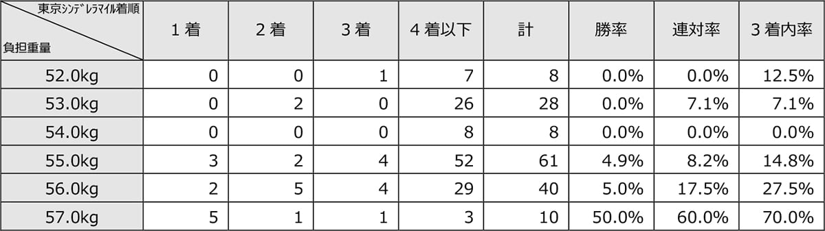 負担重量別成績を見ると、54.0kg以下の馬は[0-2-1-41](3着内率6.8%)、「55.0kg」の馬は[3-2-4-52](3着内率14.8%)、「56.0kg」の馬は[2-5-4-29](3着内率27.5%)、57.0kg以上の馬は[5-1-1-3](3着内率70.0%)となっている。在籍しているクラスや過去の成績に応じた負担重量を課される別定競走だが、比較的軽い負担重量を課された馬は割り引きが必要だ。
