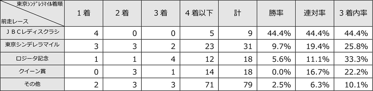 前走のレース別成績を見ると、3着以内となった回数が2回以上なのは、「JBCレディスクラシック」「東京シンデレラマイルトライアル(令和2年までは「シンデレラマイルトライアル」の名称で施行)」「ロジータ記念」「クイーン賞」の4レースとなっている。なお「東京シンデレラマイルトライアル」が施行されるようになった第12回(平成30年)以降の過去7年に限ると、「JBCレディスクラシック」の馬は[2-0-0-4](3着内率33.3%)、「東京シンデレラマイルトライアル」の馬は[3-3-2-23](3着内率25.8%)、「ロジータ記念」の馬は[1-0-2-8](3着内率27.3%)、「クイーン賞」の馬は[0-2-1-9](3着内率25.0%)、「その他」の馬は[1-2-2-42](3着内率10.6%)である。今年は「東京シンデレラマイルトライアル」が施行されず、新設されたローズベール賞の1~3着馬に東京シンデレラマイルへの優先出走権を付与する形となったが、このローズベール賞をはじめとする主要な前哨戦に出走していた馬を重視したい。
