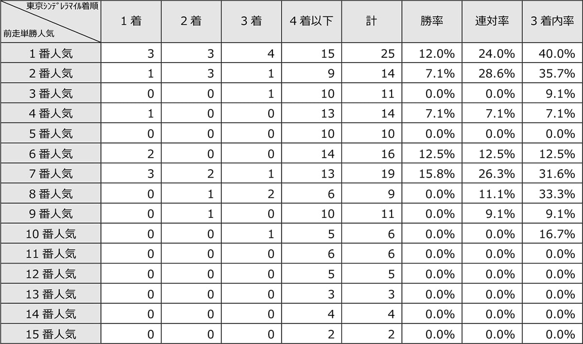 前走の単勝人気順別成績を見ると、2番人気以内の馬は[4-6-5-24](3着内率38.5%)、3~10番人気の馬は[6-4-5-81](3着内率15.6%)、11番人気以下の馬は[0-0-0-20](3着内率0.0%)となっている。なお、第12回(平成30年)以降の過去7年に限ると、2番人気以内の馬は[4-4-5-15](3着内率46.4%)、3~8番人気の馬は[3-3-2-50](3着内率13.8%)、9番人気以下の馬は[0-0-0-21](3着内率0.0%)である。直近の競走成績を比較する際は、当時の人気もチェックしておくべきだろう。