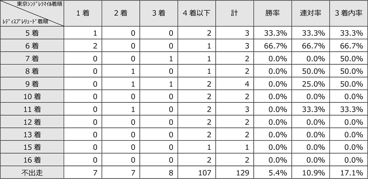“同年のレディスプレリュード”における着順別成績を見ると、11着以内の馬は[3-3-2-11](3着内率42.1%)、12着以下の馬は[0-0-0-7](3着内率0.0%)、不出走の馬は[7-7-8-107](3着内率17.1%)となっている。TCKで施行される牝馬限定のダートグレード競走だけに、“同年のレディスプレリュード”を使っていた馬はマークしておきたいところだ。