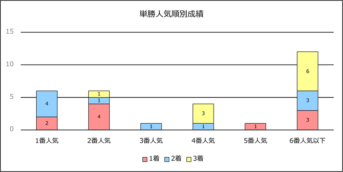 単勝人気順別成績を見ると、2番人気以内の馬は[6-5-1-8](3着内率60.0%)、3~12番人気の馬は[4-5-9-82](3着内率18.0%)、13番人気以下の馬は[0-0-0-36](3着内率0.0%)となっている。上位人気勢の好走率はそれなりに優秀だが、人気薄の馬にも注目しておいた方が良さそうだ。