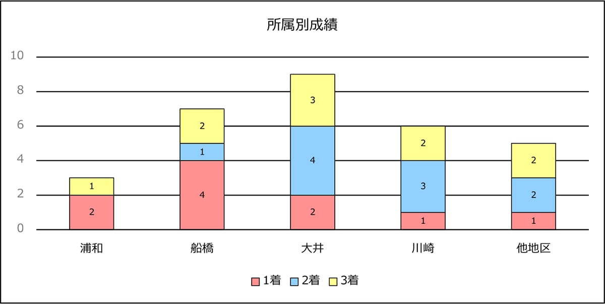 所属別成績を見ると、「浦和」の馬は[2-0-1-11](3着内率21.4%)、「船橋」の馬は[4-1-2-20](3着内率25.9%)、「大井」の馬は[2-4-3-55](3着内率14.1%)、「川崎」の馬は[1-3-2-19](3着内率24.0%)、「他地区」の馬は[1-2-2-21](3着内率19.2%)となっている。「大井」所属馬の3着内数が比較的多かったものの、3着内率は他の南関東所属馬や「他地区」所属馬の方が高い。