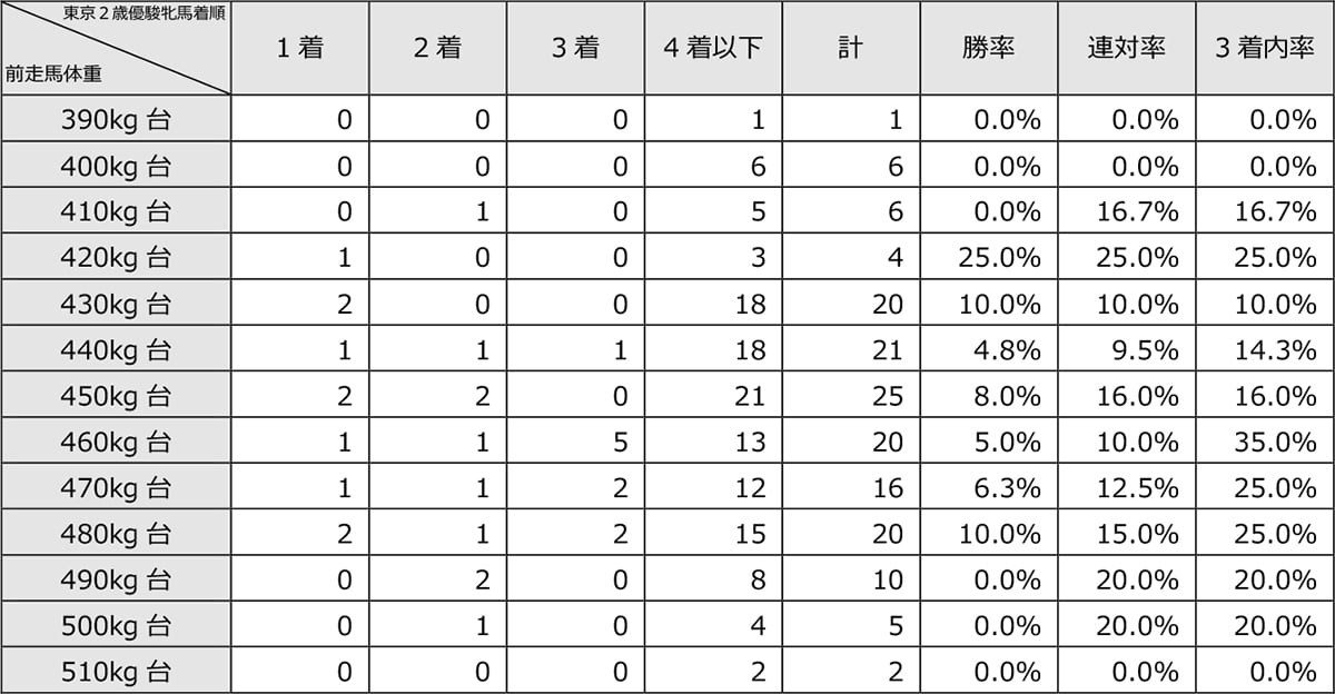 前走の馬体重区分別成績を見ると、460kg未満の馬は[6-4-1-72](3着内率13.3%)、460kg以上の馬は[4-6-9-54](3着内率26.0%)となっている。なお、第44回(令和2年)以降の過去5年に限ると、460kg未満の馬は[2-1-0-37](3着内率7.5%)、460kg以上の馬は[3-4-5-25](3着内率32.4%)である。小柄な馬は過信禁物と見るべきだろう。