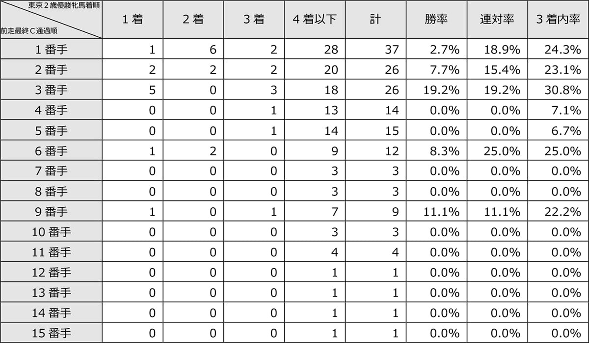 前走の最終コーナー通過順別成績を見ると、3番手以内の馬は[8-8-7-66](3着内率25.8%)、4~9番手の馬は[2-2-3-49](3着内率12.5%)、10番手以下の馬は[0-0-0-11](3着内率0.0%)となっている。脚質も重要なポイントと言えそうだ。