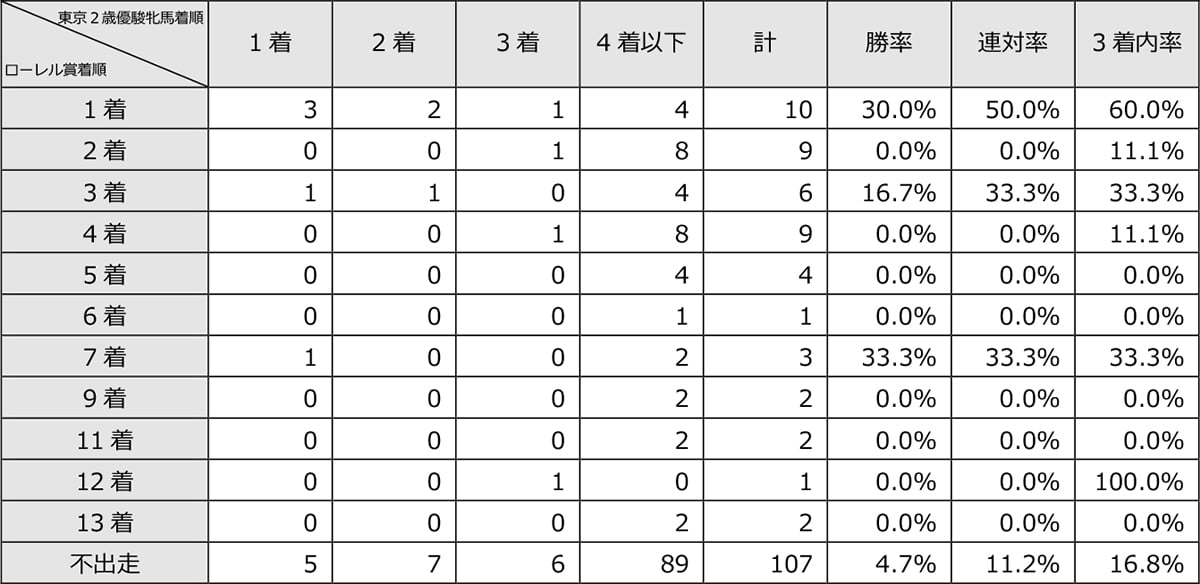 “ローレル賞”における着順別成績を見ると、「1着」の馬は[3-2-1-4](3着内率60.0%)、2着以下の馬は[2-1-3-33](3着内率15.4%)、不出走の馬は[5-7-6-89](3着内率16.8%)となっている。主要な前哨戦である“ローレル賞”の優勝馬が出走してきたら、しっかりマークしておきたい。