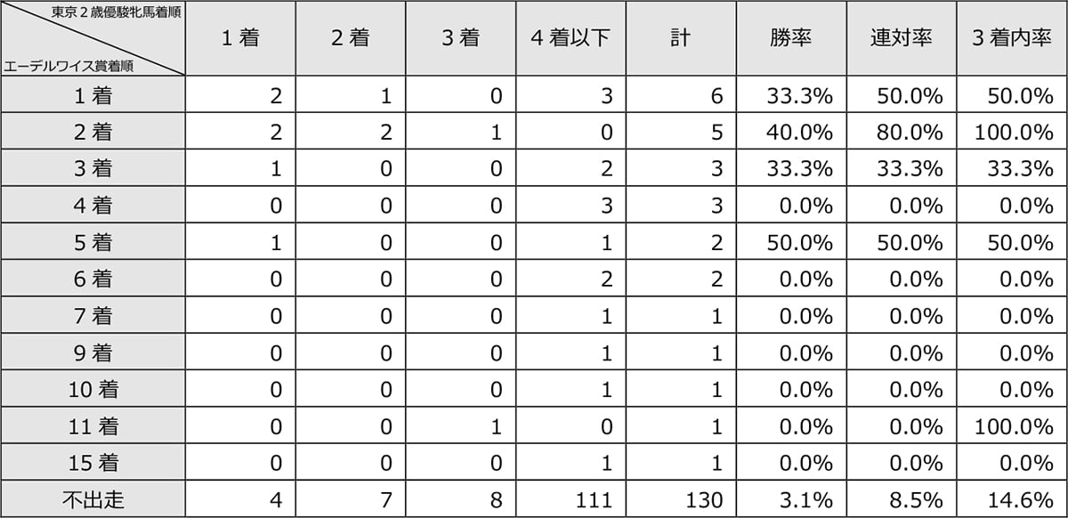 “エーデルワイス賞”における着順別成績を見ると、2着以内の馬は[4-3-1-3](3着内率72.7%)、3~5着の馬は[2-0-0-6](3着内率25.0%)、6着以下の馬は[0-0-1-6](3着内率14.3%)、「不出走」の馬は[4-7-8-111](3着内率14.6%)となっている。2歳牝馬限定のダートグレード競走である“エーデルワイス賞”に出走していた馬、特にその“エーデルワイス賞”で健闘した馬は、高く評価するべきだろう。