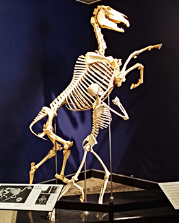 4月のキーンランドでは、時間に少し余裕があったのでケンタッキーホースパークに行ってきました。この場所について言えることは、とにもかくにも「馬」です。いろいろな種類の馬が繋養されていたり、モチーフは全て馬です。ちなみに今年は午年ということもあり、付近の教育機関で日本語の書き初めにトライしたようで、入館直後の壁に小学生と思しき挑戦者の書き初めが展示してありました(写真5)。かわいいですよね(笑)挑戦者の皆さんが、日本語の書き初めに四苦八苦している姿が目に浮かびます。展示スペースに足を踏み入れると、そこには馬と人間の骨格の模型が展示されていました(写真6)。馬のどの部位が、人間の部位のどこかというのが対照的になっています。