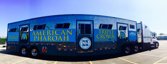 今日、6月18日。無事にアメリカンフェイローはお家であるサンタアニタに到着(写真1・2)。なぜ、バファート師の横に警官が立っているのかというと、オンタリオ国際空港からサンタアニタ競馬場まで、アメリカンフェイローは6人の護衛が付いて送られてきたからです!さすがアメリカですね!しかも、こんなに派手に飾られた馬運車で(写真3~7)。当の本人からは、「やれやれ、やっと着いたか・・・ふ~。」というため息が聞こえてきそうですが。