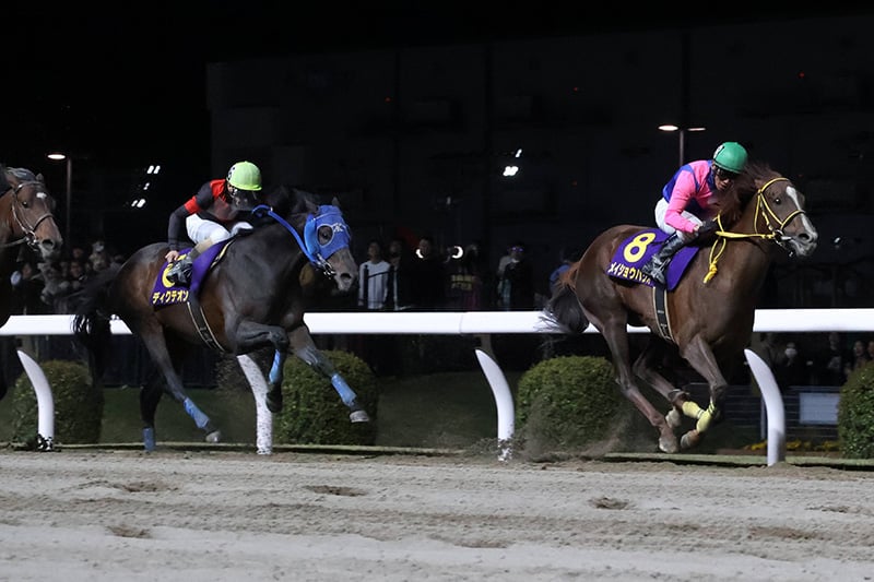 川崎記念で勝ち馬のメイショウハリオを追う2着のディクテオン