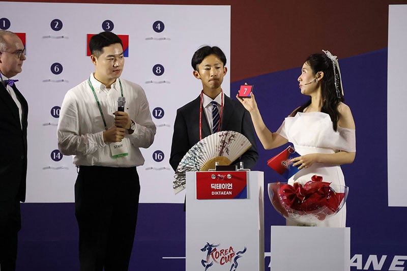 追い切りを終えた藤田騎手には同日、枠順抽選という大役も待っていた。ソウル競馬場のスタンド6階にあるコンベンションホールで行われた枠順抽選会は、まず司会のアナウンサーが馬名の書かれた紙が入った福チュモニ(巾着袋)を選び、選ばれた陣営の代表者が登壇して番号を抽選するという流れ。抽選には韓国の伝統工芸品などが使われ、今回は絵や文言の書かれた扇子を選ぶという方法だった。その扇子とともに置かれた名刺入れのふたを取ると、その裏に番号が書かれているというもの。3番目に登壇した藤田騎手は、竹の描かれた扇子を選択。11頭立ての7番に決まった。「先生に知らせたら、7番は合格点らしいです」。あとは無事に本番を迎えられれば、というところまできた。