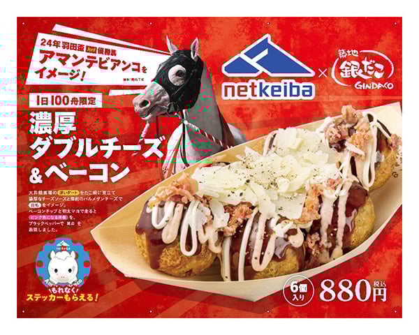 大井競馬場内「築地銀だこ」にて、netkeibaとのコラボ企画を12月1日(日)より期間限定で実施いたします。期間中は、2024年羽田盃優勝馬「アマンテビアンコ」をイメージしたコラボメニューを販売いたします。さらに、コラボメニューをご購入いただいたお客様には、「アマンテビアンコ」オリジナルステッカーをプレゼント!