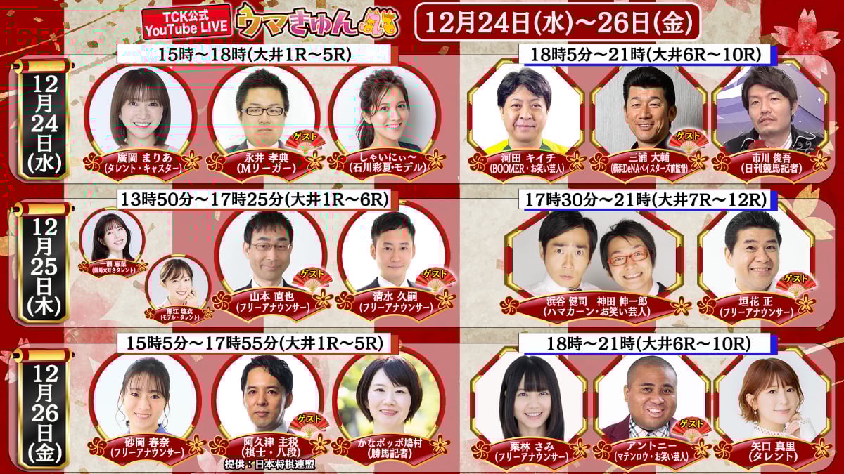 一瀬恵菜さん (競馬大好きタレント) かなポッポ鳩村さん(勝馬) 栗林さみさん (フリーアナウンサー) しゃいにぃ~さん (石川彩夏・モデル) BOOMER 河田キイチさん (お笑い芸人) |