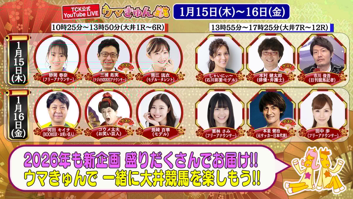 大井競馬開催日は毎日、日替わりのレギュラー陣がゆるいトークやまったり予想をお届けする公式YouTubeライブ番組「ウマきゅん」を実施します。豪華ゲストや大井競馬場名物 予想屋さんの予想コーナーのほか、視聴者プレゼントやチャット機能を利用したベストチャット選定など、視聴者のみなさまも一緒にお楽しみいただける、充実した内容でお届けします。