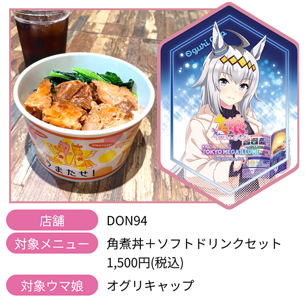 12月31日(火)までの大井競馬開催日に、東京メガイルミ営業日に販売している「ウマ娘 プリティーダービー」のオリジナルノベルティ付コラボ限定フードを競馬開催日にも販売します。対象店舗で対象メニューを購入していただくと、キャラクターピック(店舗別固定)とホログラムステッカー(ランダム)をプレゼントいたします。