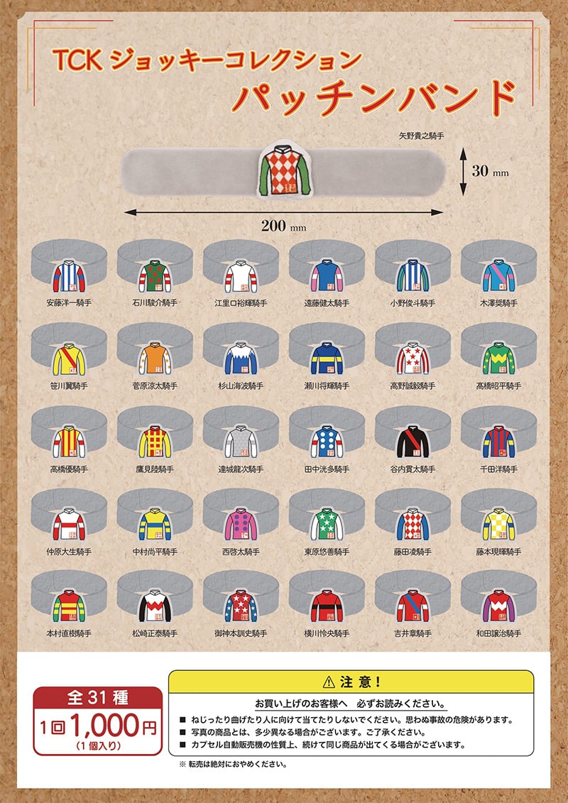 G-FRONT1階ゲームコーナーに設置しているカプセルトイ自動販売機に新商品の「TCKジョッキーコレクション パッチンバンド」が登場しました!1回1000円で全31種類のいずれかが入っています。