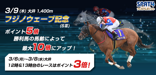 SPAT4プレミアムポイントでは、3月9日(木)フジノウェーブ記念(SⅢ)をご購入いただくとポイントが5倍~最大10倍になる「フジノウェーブ記念キャンペーン」を実施します。そのほかにも、ポイント3倍対象レースが盛りだくさんとなっておりますので、フジノウェーブ記念開催をお得にお楽しみください。