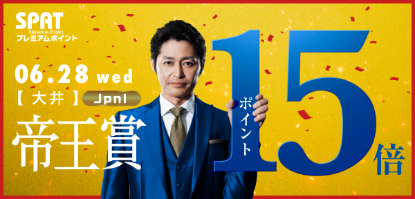 SPAT4プレミアムポイントでは、6月28日(水)帝王賞(JpnⅠ)をご購入いただくとポイントが15倍になる「帝王賞キャンペーン」を実施します。そのほかにも、ポイントが3倍~5倍になる対象レースが盛りだくさんとなっておりますので、帝王賞開催をお得にお楽しみください。