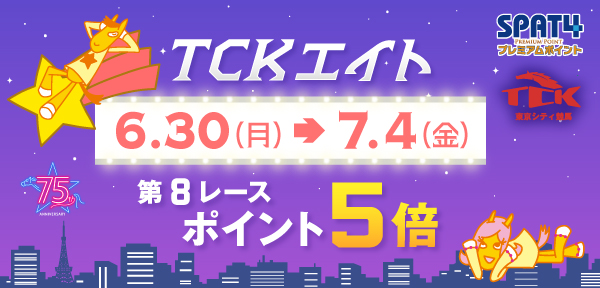 SPAT4プレミアムポイントでは、第8レースをご購入いただくとポイントがなんと5倍になる「TCKエイトキャンペーン」を実施します。ご自宅でもお帰り途中でも、18時からのTWINKLE NIGHTをどうぞお楽しみください。