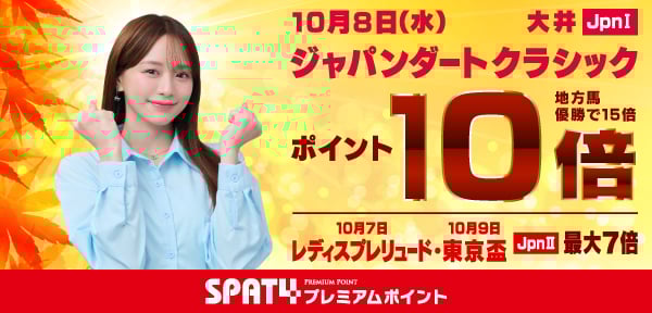 SPAT4プレミアムポイントでは、10月7日(火)レディスプレリュード(JpnⅡ)、10月8日ジャパンダートクラシック(JpnI)、10月9日(木)東京盃(JpnⅡ)の対象レースをご購入いただいた方を対象に、ポイントが最大15倍になるほか、豪華グッズが当たる「ジャパンダートクラシックキャンペーン」を実施します。