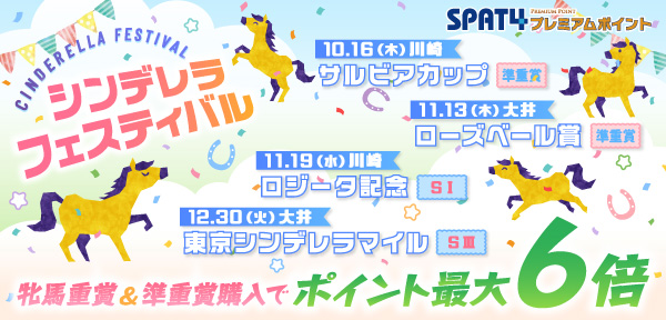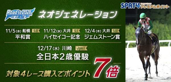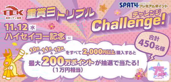 SPAT4プレミアムポイントでは、11月12日(水)の大井競馬第10レースから第12レースまでの3レースを各2,000円以上ご購入いただいた方を対象に、抽選で450名様にSPAT4プレミアムポイントを最大200万ポイントプレゼントする「TCK重賞日トリプルチャンスキャンペーン」を実施します。重賞競走当日の後半3レースをお得にお楽しみください。