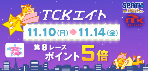 SPAT4プレミアムポイントでは、第8レースをご購入いただくとポイントがなんと5倍になる「TCKエイトキャンペーン」を実施します。ご自宅でもお帰り途中でも、18時からのTWINKLE NIGHTをどうぞお楽しみください。