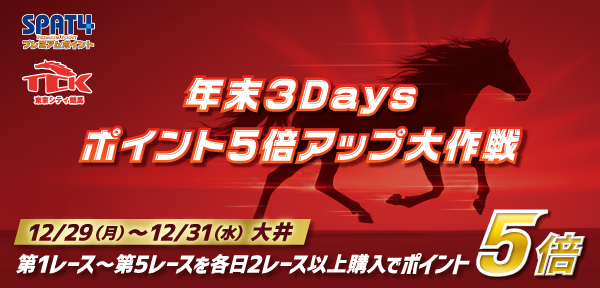 SPAT4プレミアムポイントでは、12月29日(月)から12月31日(水)までの各日、大井競馬第1レースから第5レースを2レース以上ご購入いただいた方を対象にポイントが5倍になる「年末3Days ポイント5倍アップ大作戦」を実施します。