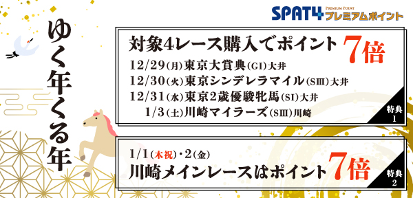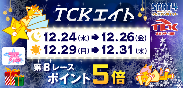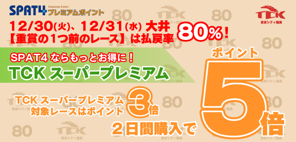 SPAT4プレミアムポイントでは、12月30日(火)から12月31日(水)の大井競馬第9レースを対象に、2日間ご購入でポイントが5倍(1日ご購入の場合3倍)となる「もっとお得に! TCKスーパープレミアム!」を実施します。