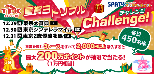 SPAT4プレミアムポイントでは、12月29日(月)から12月31日(水)の対象レースをすべて2,000円以上購入された方の中から、各日抽選で合計450名様に最大200万ポイントが当たる「TCK重賞日トリプルチャレンジキャンペーン」を実施します。重賞競走当日は、3レース購入でお得にお楽しみください。