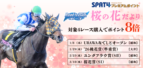SPAT4プレミアムポイントでは、1月28日(水)金盃(SⅡ)をご購入いただくとポイントが7倍になるほか、1月26日(月)から1月30日(金)の大井競馬第10レースをご購入いただくとポイントが2倍になる「金盃キャンペーン」を実施します。