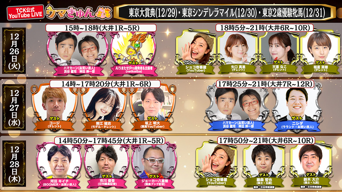 大井競馬開催日は毎日、日替わりのレギュラー陣がゆるいトークやまったり予想をお届けする公式YouTubeライブ番組「ウマきゅん」を実施します。豪華ゲストや大井競馬場名物 予想屋さんの予想コーナーのほか、視聴者プレゼントやチャット機能を利用したベストチャット選定など、視聴者のみなさまも一緒にお楽しみいただける、充実した内容でお届けします。