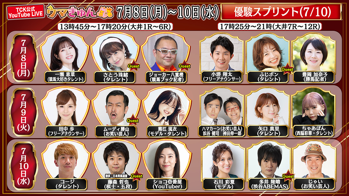 大井競馬開催日は毎日、日替わりのレギュラー陣がゆるいトークやまったり予想をお届けする公式YouTubeライブ番組「ウマきゅん」を実施します。豪華ゲストや大井競馬場名物 予想屋さんの予想コーナーのほか、視聴者プレゼントやチャット機能を利用したベストチャット選定など、視聴者のみなさまも一緒にお楽しみいただける、充実した内容でお届けします。