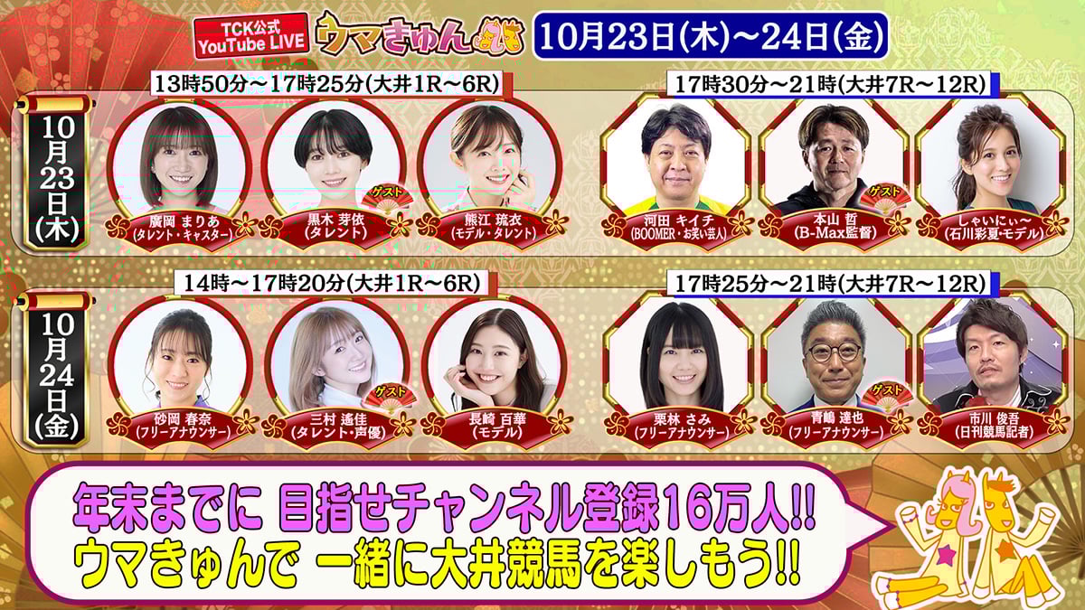 大井競馬開催日は毎日、日替わりのレギュラー陣がゆるいトークやまったり予想をお届けする公式YouTubeライブ番組「ウマきゅん」を実施します。豪華ゲストや大井競馬場名物 予想屋さんの予想コーナーのほか、視聴者プレゼントやチャット機能を利用したベストチャット選定など、視聴者のみなさまも一緒にお楽しみいただける、充実した内容でお届けします。