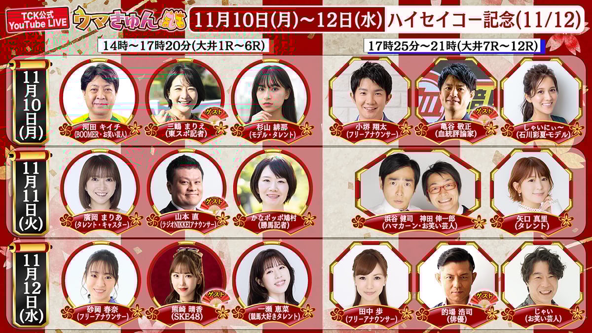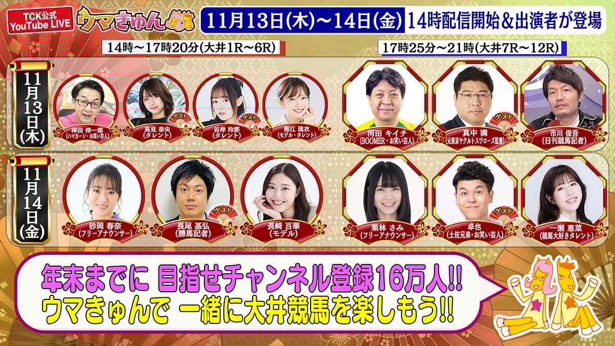 大井競馬開催日は毎日、日替わりのレギュラー陣がゆるいトークやまったり予想をお届けする公式YouTubeライブ番組「ウマきゅん」を実施します。豪華ゲストや大井競馬場名物 予想屋さんの予想コーナーのほか、視聴者プレゼントやチャット機能を利用したベストチャット選定など、視聴者のみなさまも一緒にお楽しみいただける、充実した内容でお届けします。