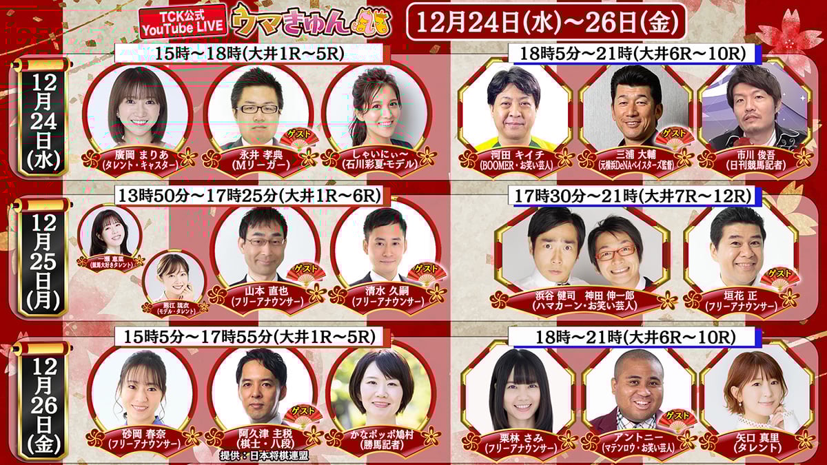 大井競馬開催日は毎日、日替わりのレギュラー陣がゆるいトークやまったり予想をお届けする公式YouTubeライブ番組「ウマきゅん」を実施します。豪華ゲストや大井競馬場名物 予想屋さんの予想コーナーのほか、視聴者プレゼントやチャット機能を利用したベストチャット選定など、視聴者のみなさまも一緒にお楽しみいただける、充実した内容でお届けします。