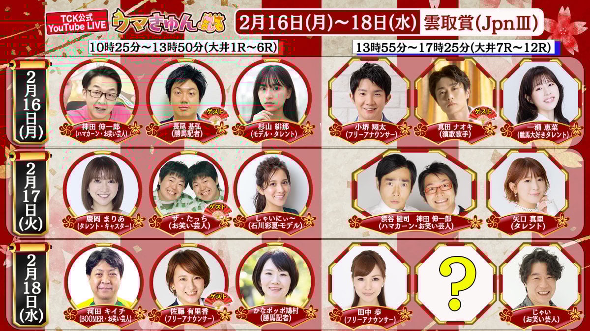 小堺翔太さん (フリーアナウンサー) 真田ナオキさん(演歌歌手) 一瀬恵菜さん (競馬大好きタレント) |