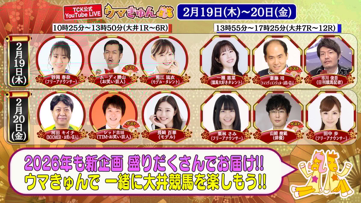 大井競馬開催日は毎日、日替わりのレギュラー陣がゆるいトークやまったり予想をお届けする公式YouTubeライブ番組「ウマきゅん」を実施します。豪華ゲストや大井競馬場名物 予想屋さんの予想コーナーのほか、視聴者プレゼントやチャット機能を利用したベストチャット選定など、視聴者のみなさまも一緒にお楽しみいただける、充実した内容でお届けします。