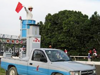 実際のスターター車の台上を体験できるスターター体験を実施。競馬中継の発走シーンに映されるスターター車、その台上に乗って発走の旗をおもいっきり振ってみよう。