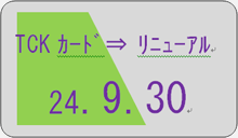 | 平成24年 8月 2日(木) 発行手続終了 9月 21日(金) ポイント付与終了 平成25年 3月 29日(金) ポイント(賞品)交換終了 ※リニューアルに伴い、現カードの獲得ポイントにつきましては、新カードへ移行できませんのでご了承ください。 | ![]() 現TCKカード |