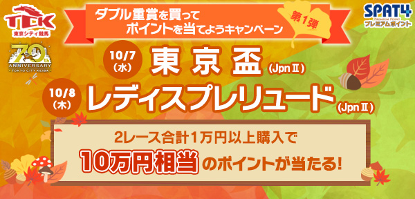 第19回開催までの各開催にあわせ、TCK×SPAT4プレミアムポイントキャンペーンを実施いたします。今開催は「ダブル重賞を買ってポイントを当てよう!キャンペーン」と題し、10月7日(水)東京盃と10月8日(木)レディスプレリュードをSPAT4で2レース合計10,000円分以上ご購入いただいた方を対象に、10万円相当のポイントが抽選で当たります。